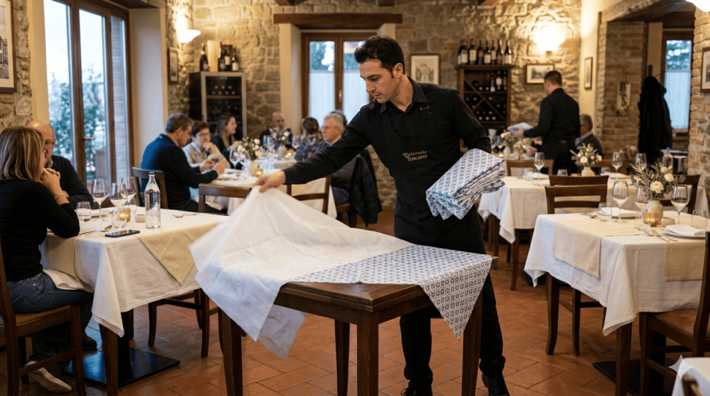 Una soluzione ibrida efficace, adottata da molti ristoratori di fascia media, è mantenere la tovaglia in tessuto come base fissa del tavolo e appoggiarvi sopra un coprimacchia TNT che viene sostituito ad ogni coperto. Questo limita i cicli di lavaggio della tovaglia principale e riduce i costi senza rinunciare all’estetica del tessuto.